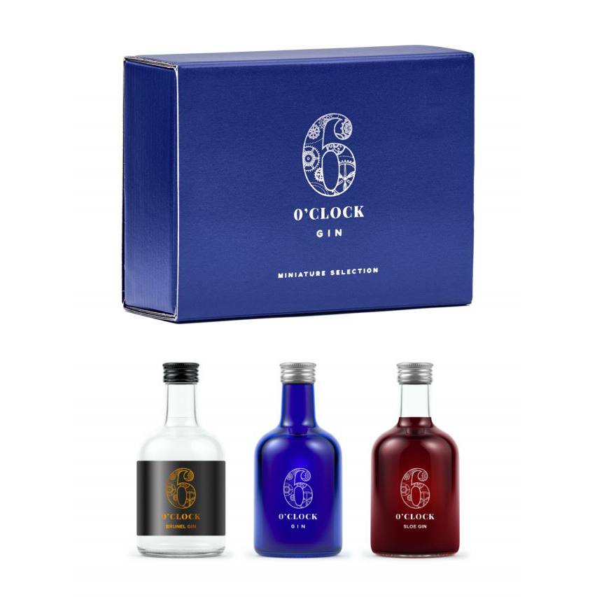 A miniature tasting tour of 6 O’clock Gin’s signature range, this gift set comprises a wonderful trio of 6 O’clock Gin’s Brunel Edition, London Dry and Sloe Gin (3 x 5cl) The miniature selection features a 5cl glass bottle of our bestsellers: 5cl 6 O’clock Gin Brunel Edition (50% ABV) 5cl 6 O’clock Gin London Dry (43% ABV) 5cl 6 O’clock Sloe Gin (26% ABV)