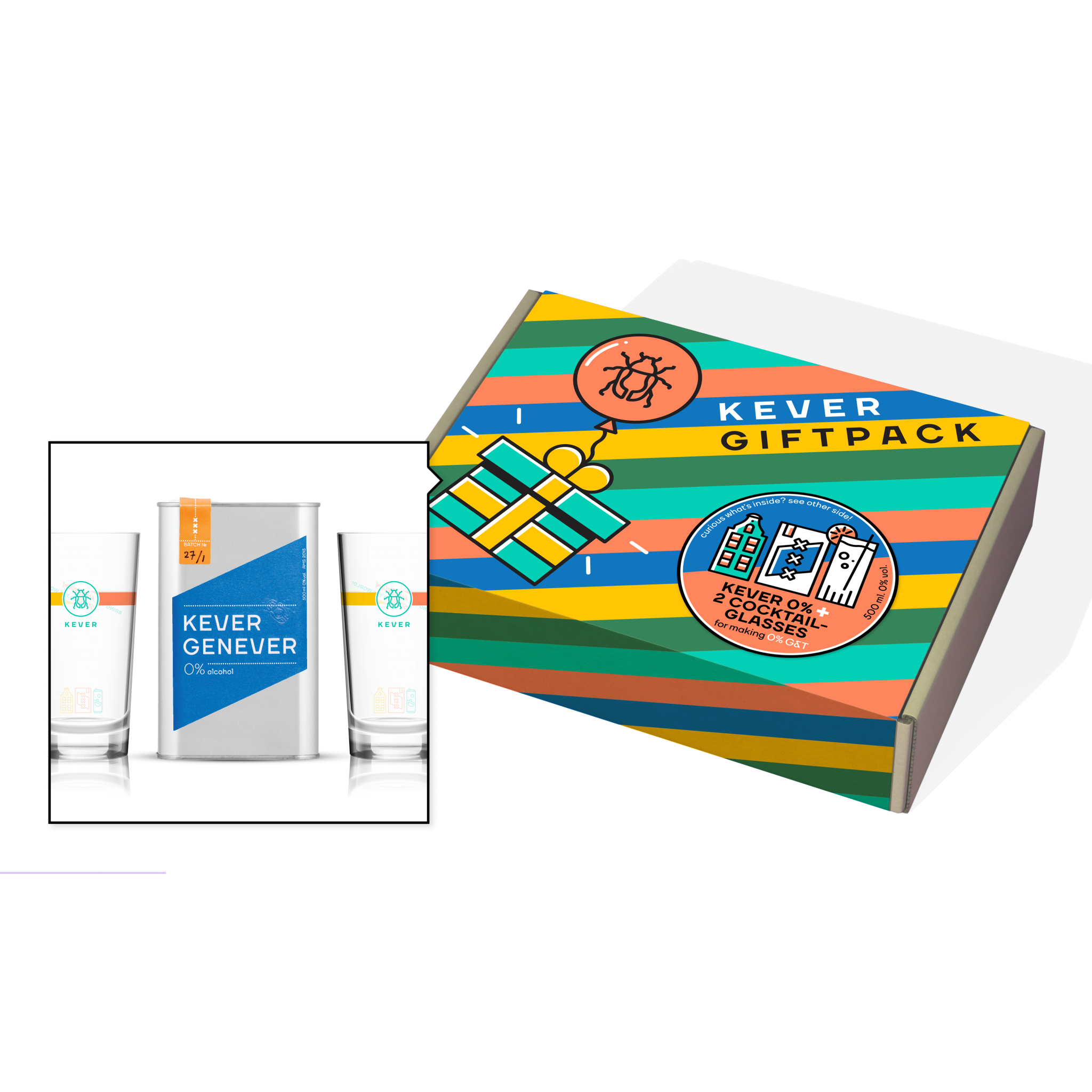 Deze Giftpack bevat 1 kenmerkend blik Kever Genever 0% met 2 matching glazen om op een verandwoorde wijze het jaar af te sluiten.